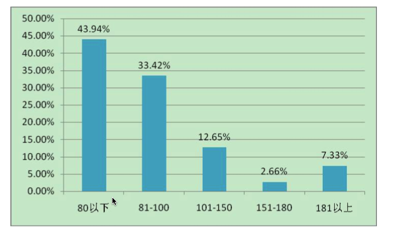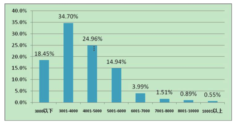 调查中,74.6%的人月平均收入在3001-5000元,14.94%的人在5001-6000元,5.5%的人在6001-8000元,月平均收入在8001元以上的占1.44%。