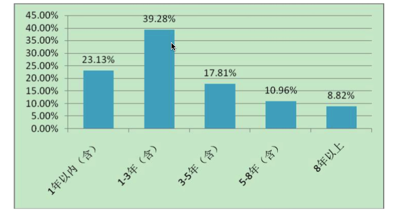 调查数据显示,工作时间超过5年的人占19.78%,占比仅两成,60%以上的人工作年限在3年以内,反映出工作流动性依然较高。调查中,62.41%的人工作年限在3年以下,28.77%的人在3-8年,8年以上的占8.82%。