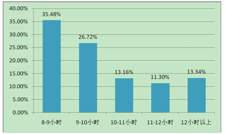 调查中,62.2%的人平均每天工作时长8-10小时,24.46%的人在10-12小时,12小时以上的占13.34%。