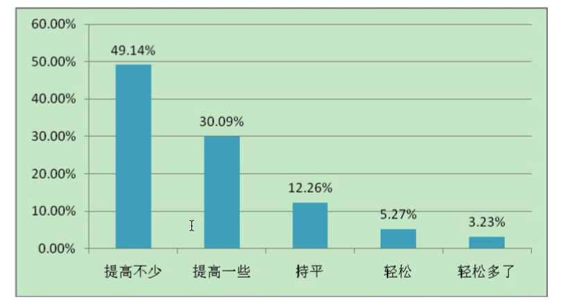 与过去的两年相比,49.14%的人认为工作强度提高不少,30.09%的人认为提高一些,20.76%的人认为工作强度基本持平或者下降。调查反映出电商物流与快递人员的工作强度都偏高,这一点上与社会对行业的认知基本一致。