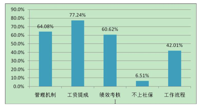 调查中,77.24%的人建议要改变现有的工资计算方式,64.08%的人认为管理机制不合理,60.62%的人认为绩效考核方法需要调整,42.01%的人认为工作流程上需要优化。