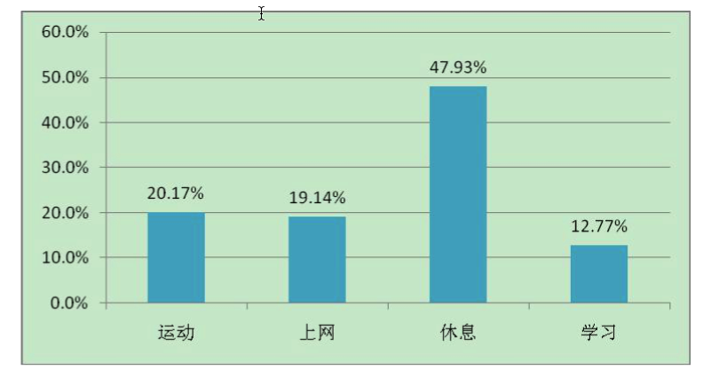 33.46%的人认为业余时间较少,21.82%的人基本没有业余时间,反映出与较长的工作时间相对应,从业人员的业余时间很少。调查中,50%的人选择休息以缓解疲劳,恢复体力,20.17%人锻炼身体,19.14%的人上网,只有12.77%的坚持学习,反映出在有限的业余时间内,从业人员以休息为主,学习和运动的时间偏少。