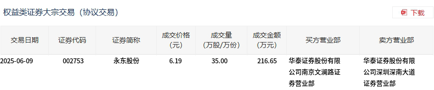 永东股份今日大宗交易折价成交35万股,成交额216.65万元