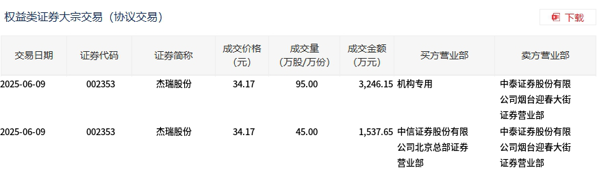 6月9日,杰瑞股份大宗交易成交140万股,成交额4783.8万元,占当日总成交额的18.33%,成交价34.17元,较市场收盘价34.58元折价1.19%。