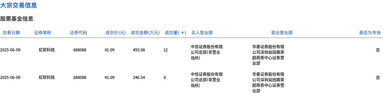 6月9日,虹软科技大宗交易成交18万股,成交额739.62万元,占当日总成交额的2.71%,成交价41.09元,较市场收盘价45.96元折价10.6%。