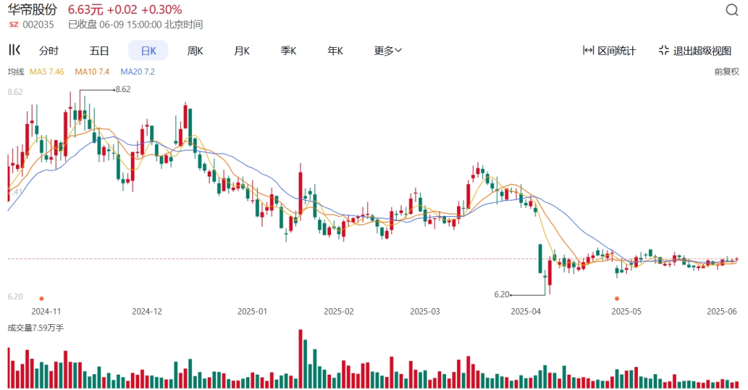 业绩增速放缓,也传导到华帝股份的股价表现上。2024年底,华帝股份的股价曾冲高至8.78元/股;截至6月9日收盘,华帝股份报收6.63元/股,股价相比去年底高点下滑超24%,总市值不足56亿元,蒸发超18亿元。