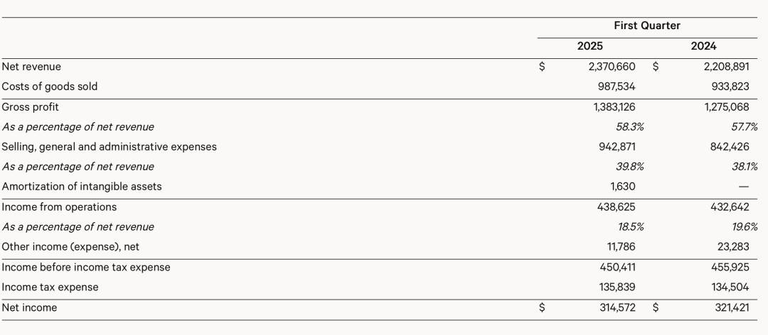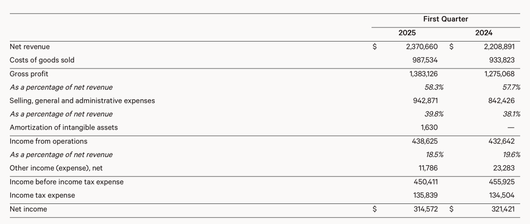 值得注意的是,lululemon第一季度的净利润出现2021年以来的首次下滑。2025财年第一季度,lululemon净利润同比下滑2.13%至3.15亿美元。而在报告期,lululemon的毛利率为其实还从57.7%增长至58.3%。