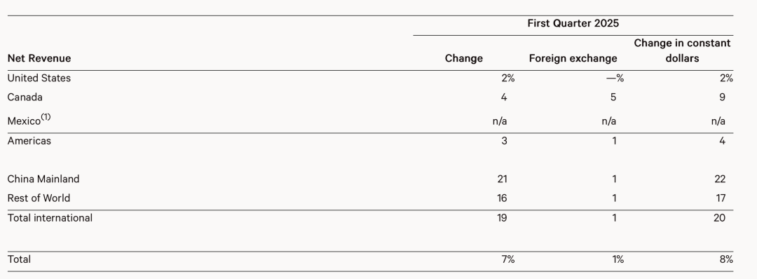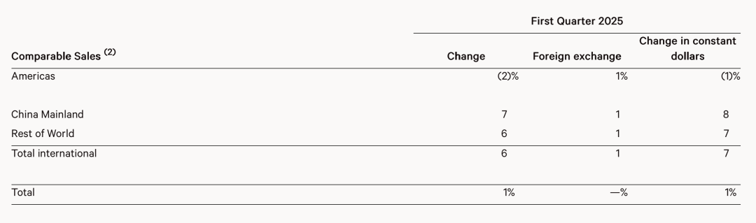 相比美洲市场,中国市场的高增速得益于门店网络的快速扩张以及可比销售额大幅提升。2025财年第一季度,lululemon在中国大陆可比销售额同比增长7%,领先于其他地区。