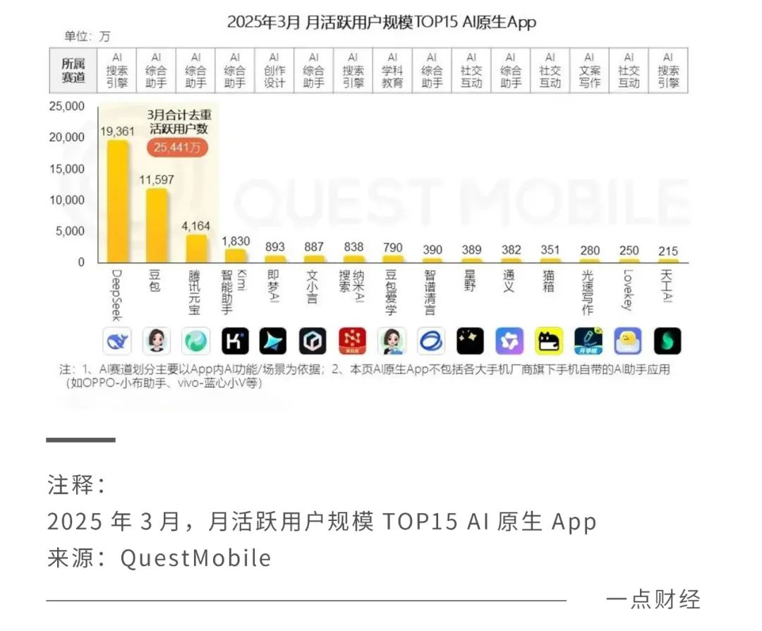 QuestMobile数据显示,今年3月月活用户TOP15的AI原生APP中,DeepSeek(19361万)、豆包(11597万)、元宝(4164万)位列前三,Kimi(1830万)排在前四,还不到元宝的一半,跟DeepSeek和豆包的差距更是明显。