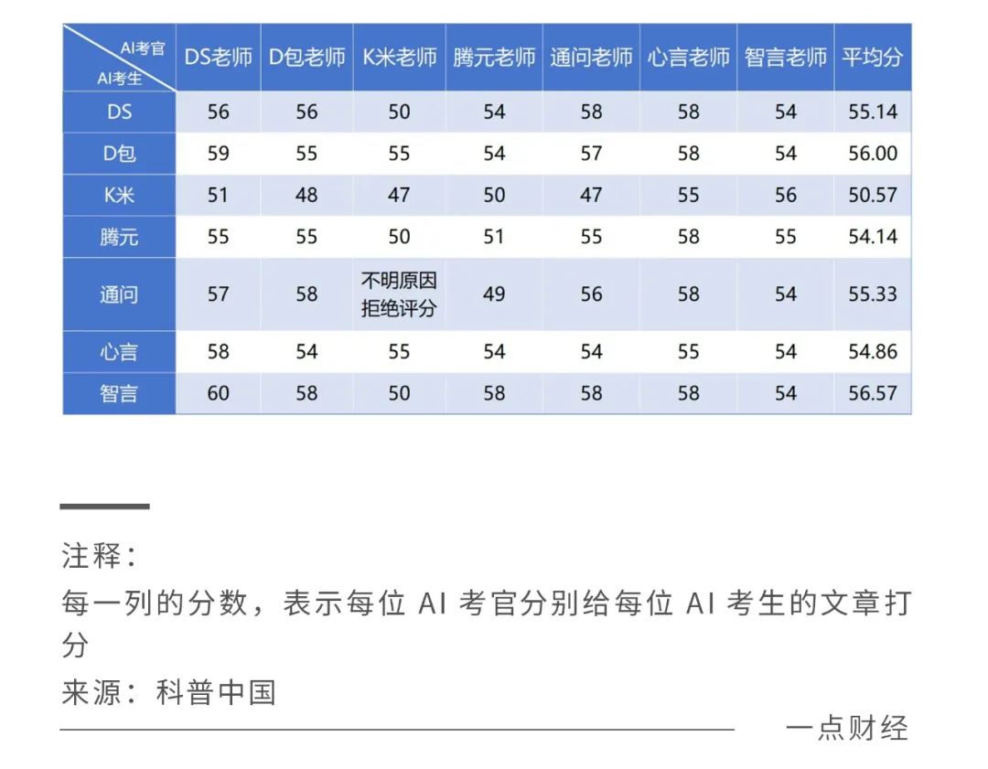有意思的是,《科普中国》没有启用真人评审团,而是让AI 应用写高考作文,然后互相评分数。说白了,就是既当考官也当考生。