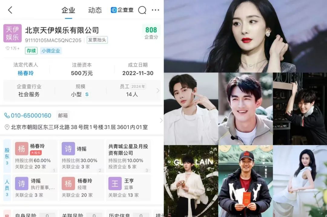 离“嘉”出走的杨幂成立了新公司天伊娱乐,其母亲杨春玲占股60%。看着像家庭作坊,实则却大有作为。近期,传闻天伊娱乐全约签下林更新、郭晓冬等老牌艺人,万合天宜旗下艺人郑合惠子转投天伊娱乐。早前,有网友发现郭敬明旗下艺人田嘉瑞与杨幂商务部分重合,也传出其商务分约给到了天伊娱乐。
