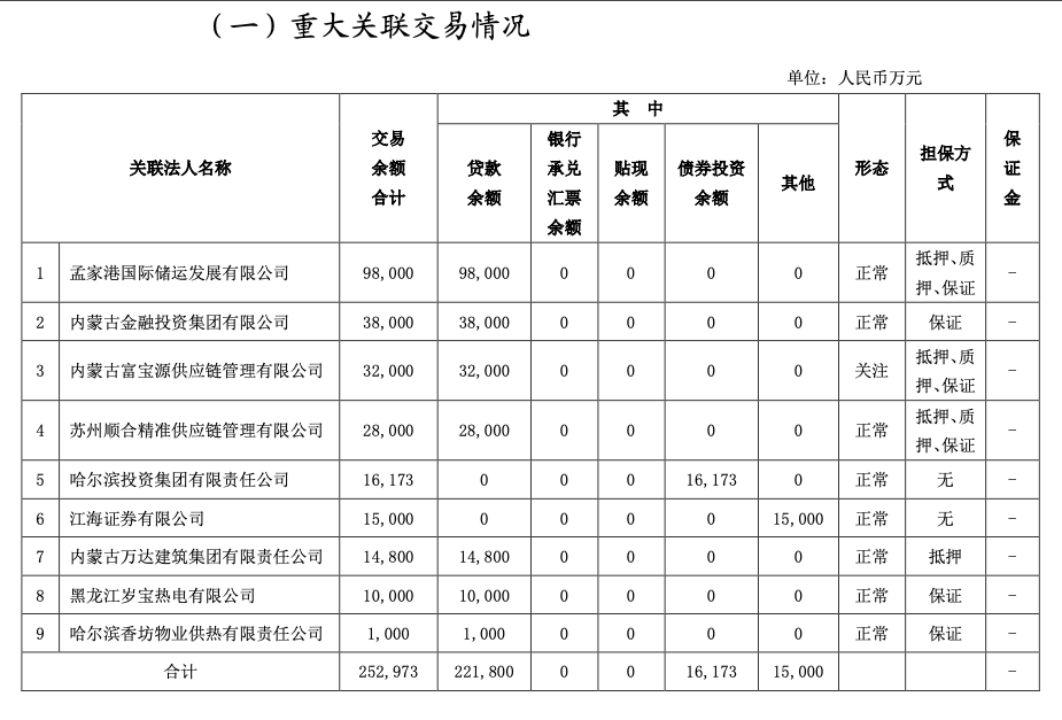 2023年,内蒙古银行与孟家港国际储运发展有限公司(以下简称“孟家港国际”)拥有交易余额9.8亿元。根据天眼查信息,2020年9月、2023年5月、2025年3月,孟家港国际及法定代表人冯成军收到限消令;内蒙古富宝源供应链管理有限公司、江海证券有限公司、黑龙江岁宝热电有限公司均在2025年成为被执行人。