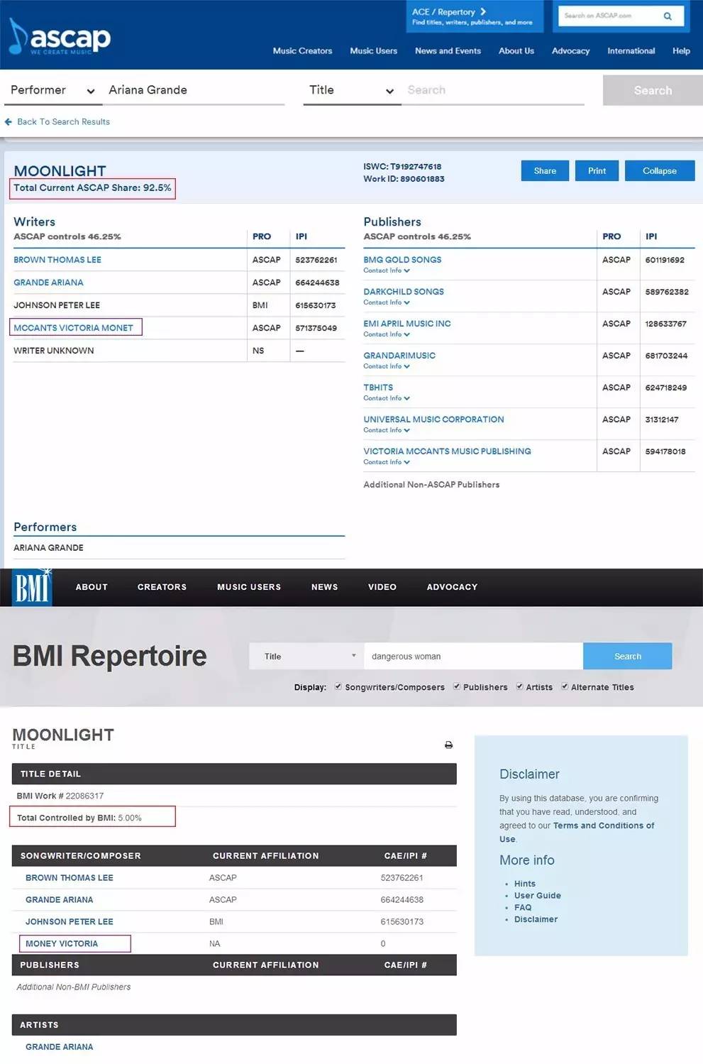 就如上图Ariana Grande的歌曲《Moonlight》在美国版权集体管理组织的注册信息所示,ASCAP(美国作曲家,作家与出版商协会)拥有这首歌版权份额的92.5%(词曲版权加代理公司版权),BMI(美国广播音乐联合协会)拥有这首歌版权份额的5%(仅词曲版权),剩下2.5%的版权份额从注册信息中无法得知。同时,在ASCAP信息中名为MCCANTS VICTORIA MONET的作者在BMI的资料库中却成了MONEY VICTORIA,且没有了IPI编号。