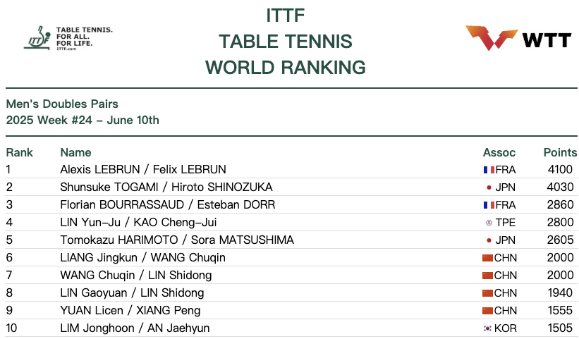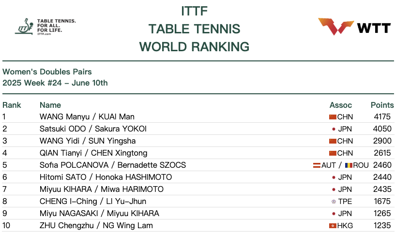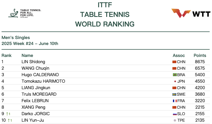 6月10日,国际乒联公布2025年第24周世界排名,男单:林诗栋、王楚钦位列前二,梁靖崑位列第五,向鹏位列第八。女单:孙颖莎 、王曼昱 、陈幸同 、王艺迪 、蒯曼位列前五。