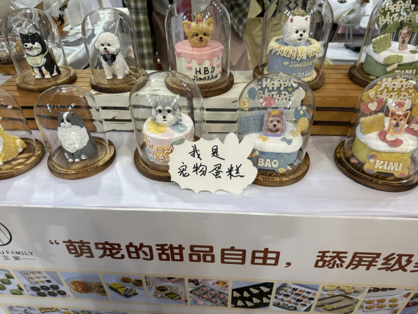 在展会现场,除了常见的宠物食品,益生菌等宠物营养品也备受关注,成为热门展品。而宠物画像、宠物烘焙等新兴服务项目,更是吸引了众多观展者的目光。一家宠物烘焙店的展台前,聚集了不少市民。展台上摆放着各式精美的宠物蛋糕,工作人员介绍,这些蛋糕是专门为宠物定制的,均价百元起。“猫咪是食肉动物,给猫咪做的蛋糕就是纯肉的;狗狗的蛋糕可能会添加一些蔬菜水果等,用的奶油也是宠物专用,不含任何添加剂,对宠物身体无害。”