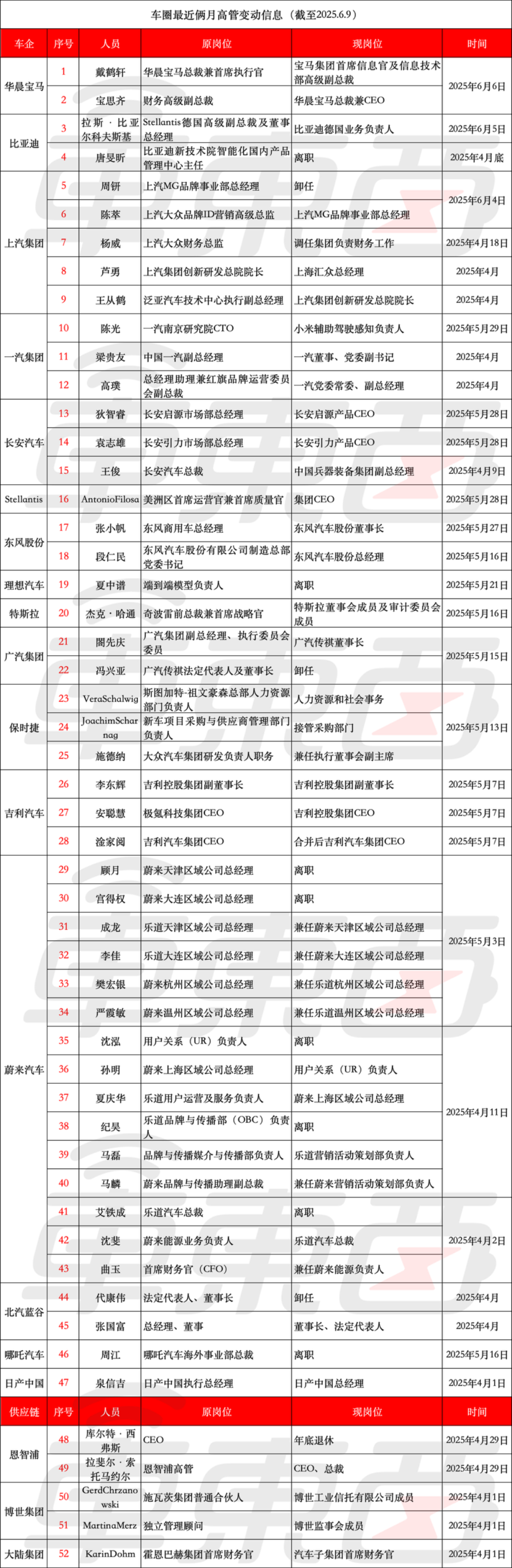 据车东西不完全统计,自今年4月份开始,车圈52位高管岗位大调整,这其中既包括小米、理想、蔚来等新造车企业,也包括比亚迪、吉利等民营车企,连长安、上汽、一汽、东风、广汽、北汽这6家国有车企都在换人。