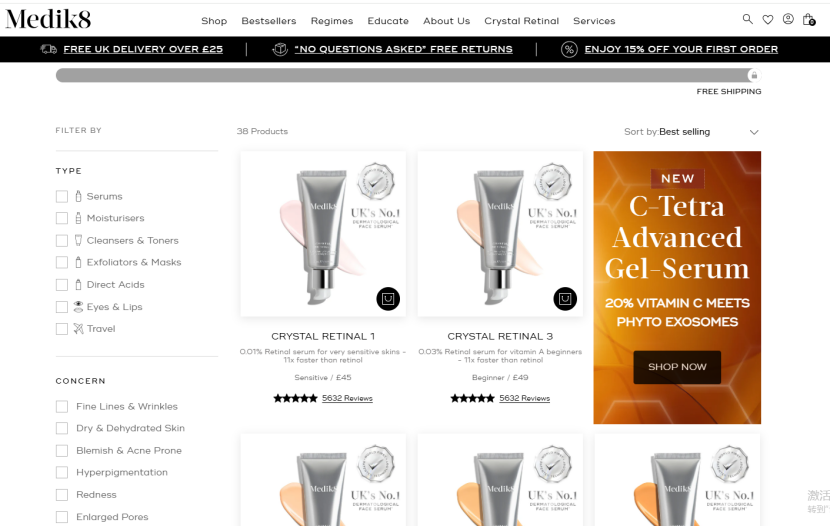 现如今,在Medik8官网中,CSA相关产品依旧位居热销榜前列。按照“最畅销”方式排序,Crystal Retinal系列、晚霜、日霜等含有维生素C、视黄醇、视黄醛等成分的单品长期占据“前排”,市场热度不减。