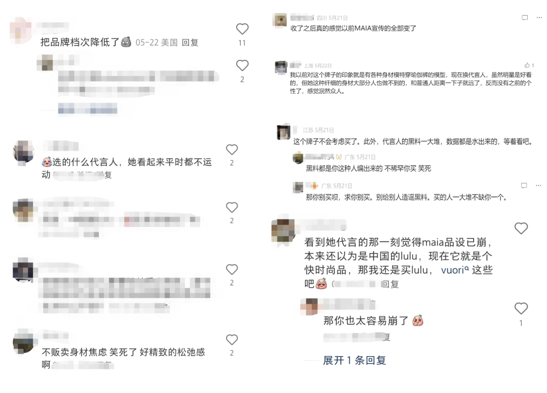 但2023被安踏收购之后,两位创始人先后退出,MAIA像是失去了精神内核,品牌动作几乎停滞,近一年的时间没有上新或者明显的营销动作。好不容易签约了一位新代言人,反而让老粉纷纷脱粉回踩。