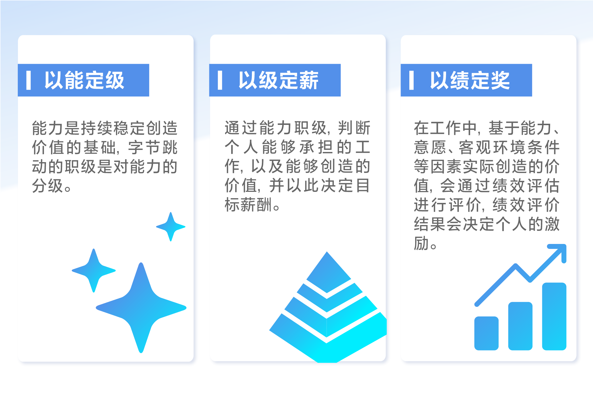 3. 敢招比自己强的人 ——字节跳动领导力原则中还有一条独特要求,“敢于招聘和发展比自己强的人”。管理者应深度参与招聘,敢于任用比自己优秀的人才,不断将团队能力提升到新的台阶。 永远要招能把团队平均水平再拉高一点的那个人,是字节跳动招聘实践中的共识。招人的时候,想一想这个人进来后比团队水平高还是低,将来能否超越自己。 敢于用比自己强的人,团队才会发展更快,同时把这些优秀人才吸引到公司,培养发展好他们,本身也是领导力强的体现。如果团队中只有管理者优秀,下属都比自己差,或者管理者去了其他岗位,团队无法选拔出继任者,那说明团队建设也不够成功。 4. 为最优秀的人提供最好的回报 ——字节跳动将人力资源看做一种投资,人力成本不重要,ROI更重要。 我们经常看到一个词,人力成本,有些企业将人才看作是成本的一部分,但是字节跳动将人力资源看作是一种投资,投资非常看重ROI(投资回报率),对人才也应该这样去想,在招人的时候,不要去看行业平均成本是多少,而应该看怎么样才能让ROI更高。只要ROI好,薪酬越多,说明回报越好,这和投资是一样的。 所以,我们内部有个观念,“为最优秀的人提供最好的回报”,人力部门每半年对市场薪酬做一次回顾,保持市场薪酬在业内领先、能吸引到最好的人。 5. 激励拉开区分度,不吃大锅饭 ——字节跳动的绩效评估要求是拉开区分度,要求管理者有判断力,准确识别每个人的能力和产出,让优秀的人得到充分激励。 当绩效分不出高低,奖励没有差别,团队很容易滑向一种“看起来很和谐”的平均主义:管理者做“老好人”,在团队激励上搞平衡,吃大锅饭。然而,久而久之,真正想做事的人热情被消磨,资历深的人开始混日子,外面优秀的人才也会觉得来晚了,内部没什么机会了。组织由此失去了持续创新和突破的活力。 因此,字节跳动在不断强调对高绩效人才的识别与激励。管理者需要识别真正的价值创造和蹭产出行为,让贡献大、潜力大的人获得真正公平的回报。2024年初,公司迭代了绩效和激励政策,目的也是加大绩效区分度,提升激励力度,尽最大的努力保留和吸引人才,只要大家有突出贡献,就能获得很好的回报,“什么时候加入公司都不晚”。 6. 以能定级,以级定薪,以绩定奖 ——以能定级,以级定薪,以绩定奖,是字节跳动的薪酬和激励理念。 我们曾经做过统计,发现薪酬和表现相比,经常会出现各种形式的溢价,熟人溢价、新人溢价、资历溢价等等,另一种情况,是能力很强但过往薪酬较低的候选人,没能给到合理的回报。所以在字节跳动内部,我们使用“以能定级,以级定薪,以绩定奖”的原则,能力是判断的出发点。 在招聘中,首先用人主管要根据候选人的个人能力评定其职级,不受对方过往薪酬的影响。HR则根据级别综合当前的市场现状和薪资水平给出offer。 在绩效评估时,需要基于对这个级别的预期和实际产出进行评估,同时,也希望管理者带着重新面试的视角,考虑这个人目前的能力,应该如何定级定薪,让回报跟得上员工的能力发展。