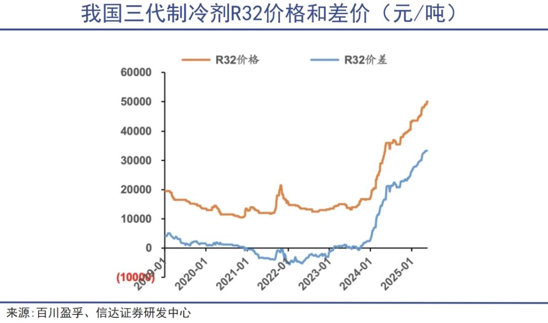 按照2025年制冷剂配额分配方案,R32增发4.5万吨配额,调增不超过10%,但二代产品R22生产和内用配额削减3.28万吨和3.10万吨,萎缩18%和28%。