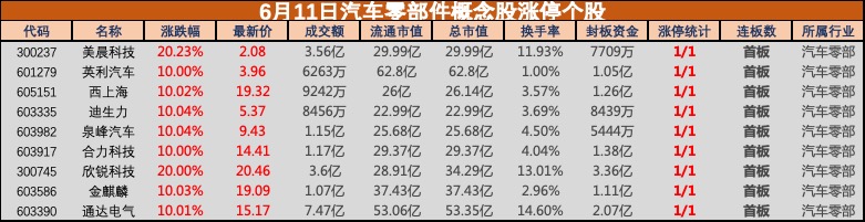 6月11日,汽车零部件概念股开盘集体走强,美晨科技(300237),欣锐科技(300745)双双20CM涨停;合力科技(603917)、迪生力(603335)、西上海(605151)、英利汽车(601279)等多股涨停;同心传动(833454)、星源卓镁(301398)等大幅跟涨。
