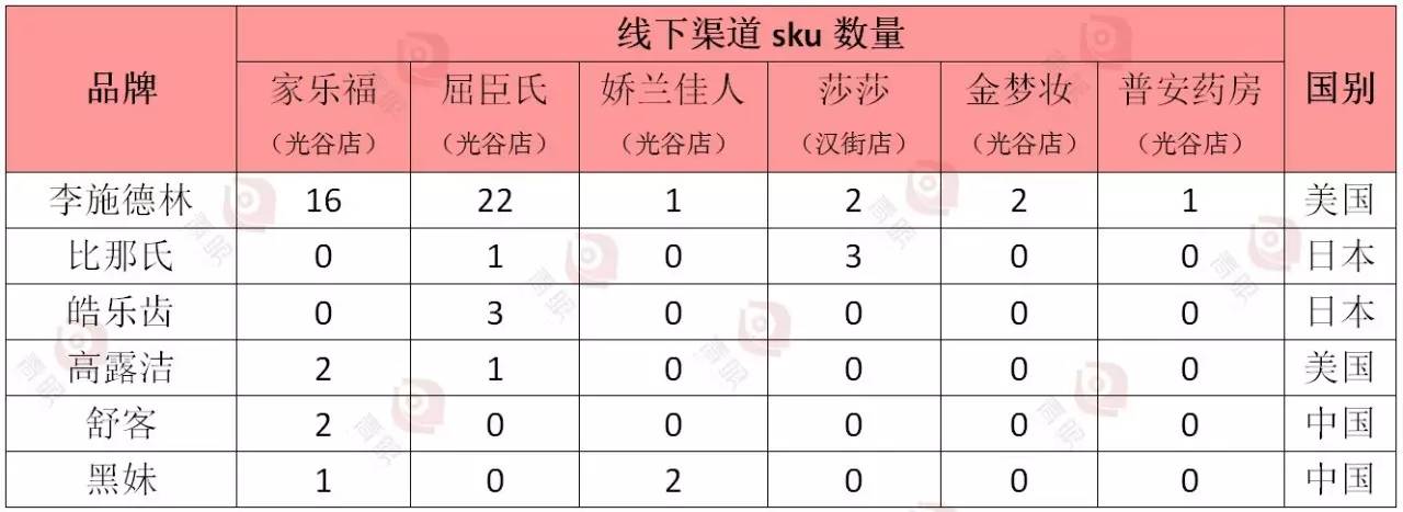 在屈臣氏光谷店、娇兰佳人光谷店、莎莎汉街店、金梦妆光谷店,除了娇兰佳人有一款黑妹漱口水在售外,其他店面在售的漱口水均来自李施德林、比那氏、皓乐齿三大进口品牌。其中,李施德林占绝对优势,在这四家化妆品店中的SKU占比为84%。而在普安大药房光谷店中,仅有一款李施德林漱口水在售。