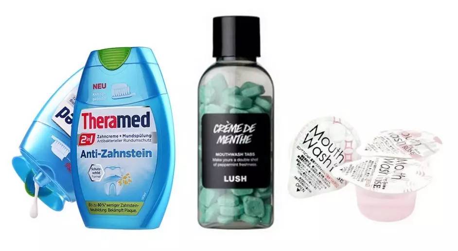 英国品牌LUSH推出的固体漱口粒,颗粒装易携带,使用也较为方便,声称将产品放在口中咬碎,再用清水漱口即可达到清洁口腔的效果,或将漱口粒放入一杯清水中,溶化后即可作为漱口水使用。国产品牌雅克菱也计划推出固体漱口水产品,并在京东上发动众筹,一度引起业内热议。此外,日本品牌OKINA推出的便携果冻型漱口水,以独立包装的形式,更方便携带。