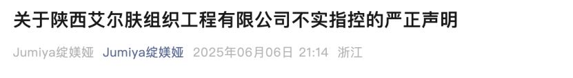 6月6日,陕西艾尔肤组织工程有限公司(下称“艾尔肤”)官方公众号“安体肤”一纸声明直指新锐国货品牌“绽媄娅”侵权,控诉其在宣传中盗用“中国人造皮肤”专利成果。声明措辞严厉,要求撤稿、道歉、赔偿。