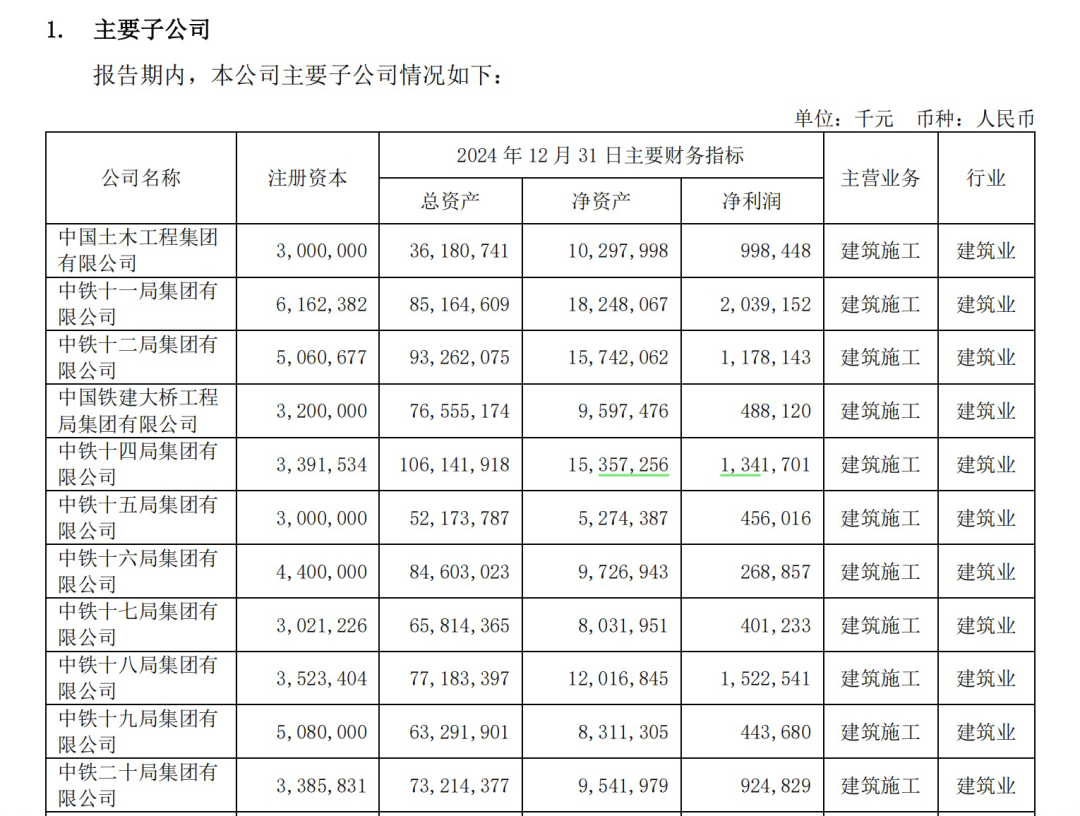 中铁十四局在中国铁建下属企业中资产规模位居前列,根据中国铁建2024年年报披露,中铁十四局2024年末资产总额1061.42亿元,净资产总额153.57亿元,资产负债率约为85.53%,2023年为82.84%,同比有所增长。2024年,中铁十四局实现净利润13.42亿元,2023年为15.18亿元,同比有所下降。