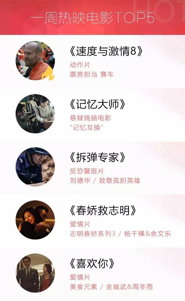 五一档,四部国产影片齐上映打擂台:悬疑推理爱好者可选择《记忆大师》,热衷警匪片的可以去看《拆弹专家》;此外,还有两部爱情片《春娇救志明》和《喜欢你》供粉丝挑选。值得一提的是,动作片《速度与激情8》票房已过23亿,突破前作指日可待。