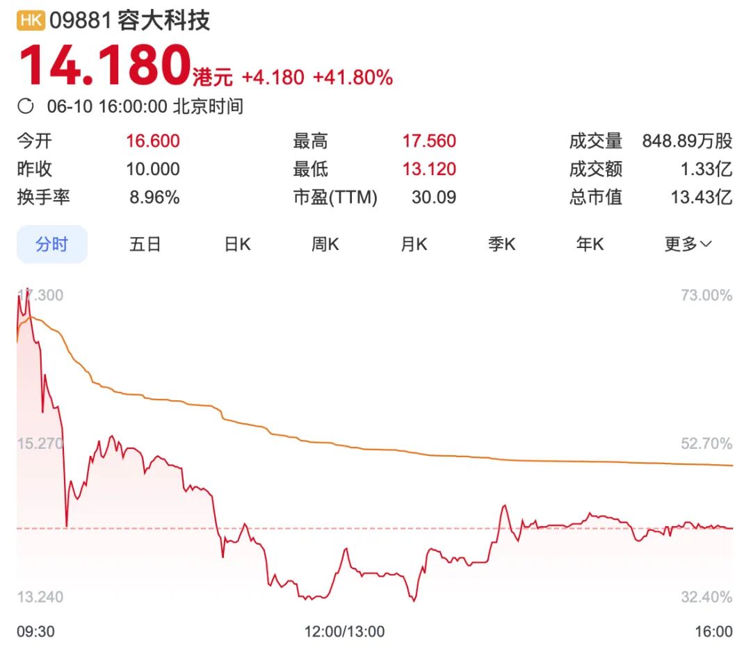今日开盘,容大科技高开66%报16.6港元/股,盘中最高触及17.56港元/股。截至收盘,容大科技涨41.80%报14.18港元/股,总市值为13.43亿港元。