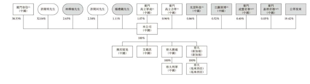 IPO后,容大科技创始人许开明直接持股32.04%,其兄弟许开河直接持股2.38%,两人通过厦门容信(许开明占99%、许开河占1%)持股38.53%,雇员持股平台厦门高立众成(许开河为普通合伙人)持股1.07%,雇员持股平台厦门高立合众(许开明为普通合伙人)持股0.96%,两兄弟合计控股约74.98%。