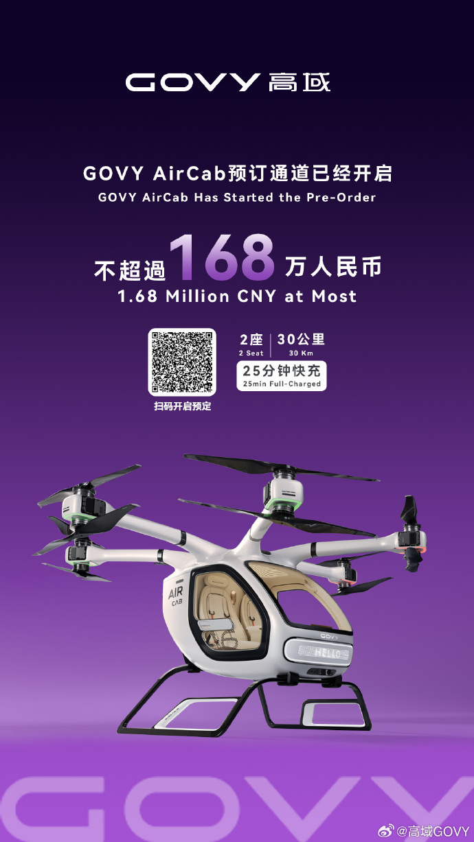 6月12日,广汽集团宣布,其首款量产飞行汽车高域AirCab在香港全球首发,并正式开启预订,官方指导价不超过168万元。