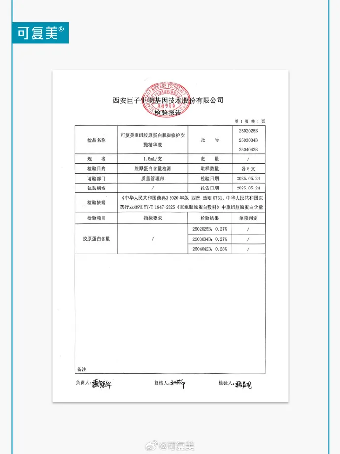 巨子生物公布了几项检测结果,并表示,可复美相关产品中真实添加重组胶原蛋白成分,不存在网传的“虚假宣传、误导消费者”行为。巨子生物还在声明中提到,“我们经历了创业以来最艰难的时刻,不是因为质疑本身,而是看到了无数消费者因信息混乱陷入焦虑之中。”