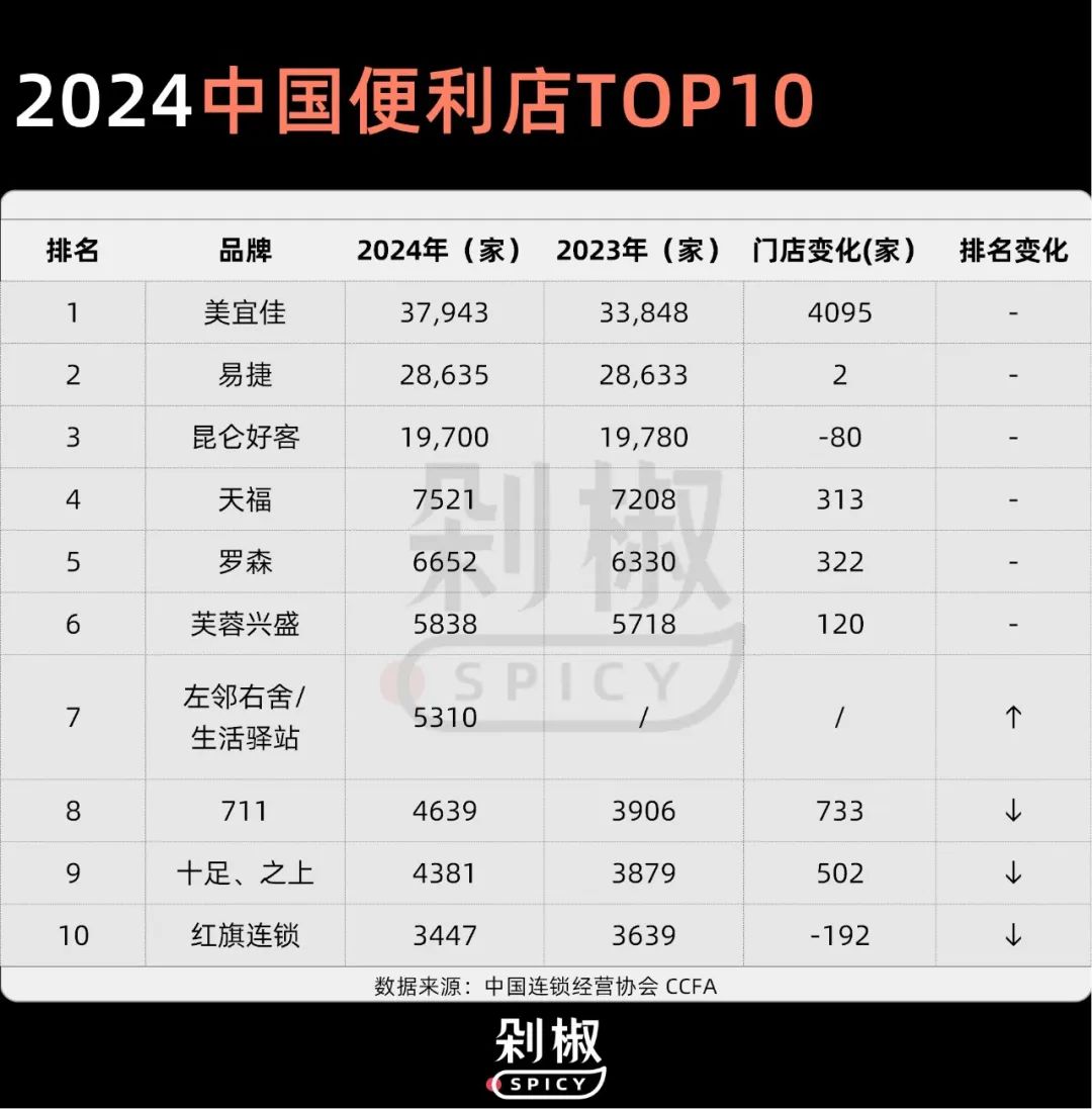 以美宜佳为代表的本土便利店呈现迅猛扩张之势。美宜佳在2024年新增4095家门店,位列第一。本土便利店赛道还杀出一匹黑马,“左邻右舍、生活驿站”,作为驰骋控股集团股份有限公司旗下的连锁商超,在2024年首次进入了便利店TOP10的队列,两个品牌以共计5310家门店,位列第七。