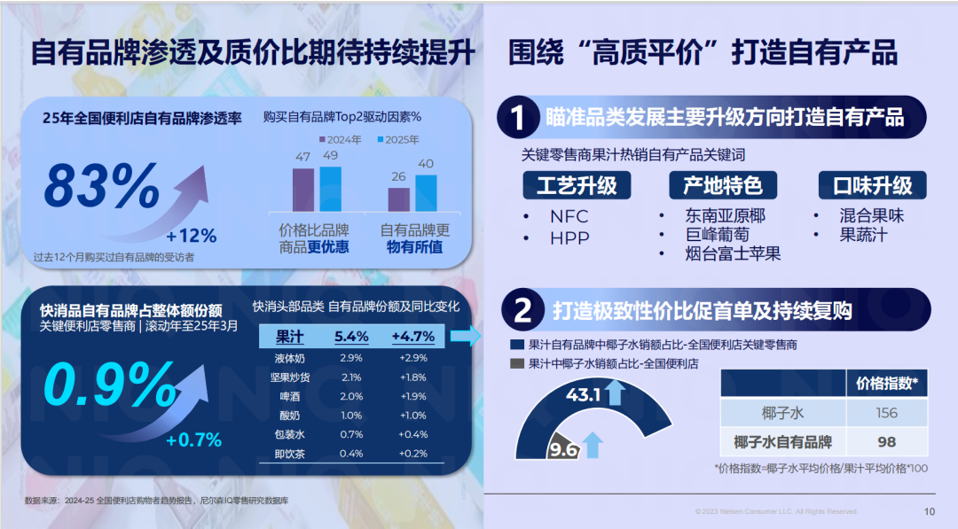 尼尔森IQ指出,2025年全国便利店自有品牌渗透率达到83%,同比提升了12%。中国消费者在注重产品性能、质量和品牌声誉的同时,愈发关注价格的合理性,在这一趋势下,渠道自有品牌产品愈发受到追捧。