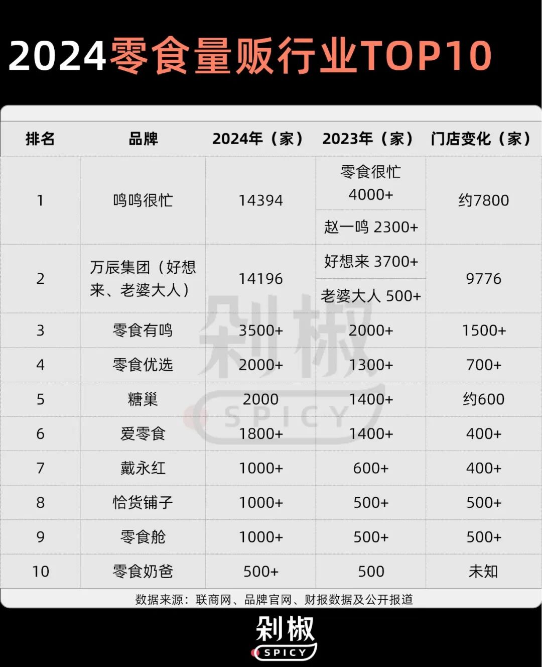 同样卷向万店规模的还有量贩零食门店,在同一家街区亦常看到赵一鸣零食、好想来超市等紧挨着出现。鸣鸣很忙(赵一鸣零食、零食很忙)、万辰集团旗下量贩零食门店(好想来、老婆大人)率先突破了里程碑,以翻倍于美宜佳的拓店速度狂飙,截至2024年门店数均突破1.4万家。