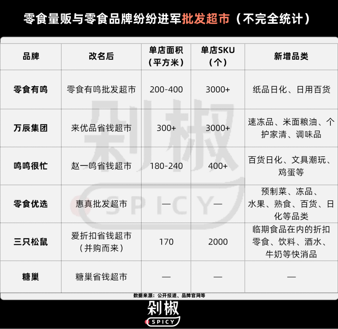 值得一提的是,由量贩零食折扣起家的鸣鸣很忙们,近年来也开始转向类似于便利店的“省钱超市”、“批发超市”新业态,商品品类从单一零食,扩大至日化、生鲜冻品等领域,瞄准消费者“一站式购物”的需求。