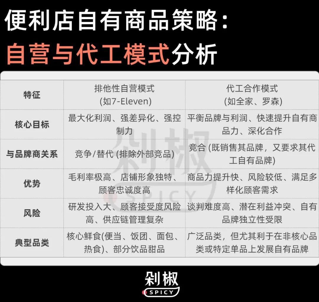 纵观当下便利店行业在打造自有品牌策略上,主要分为排他性自营模式,和代工合作模式,前者的代表是711,后者代表为全家和罗森以及本土便利店品牌。