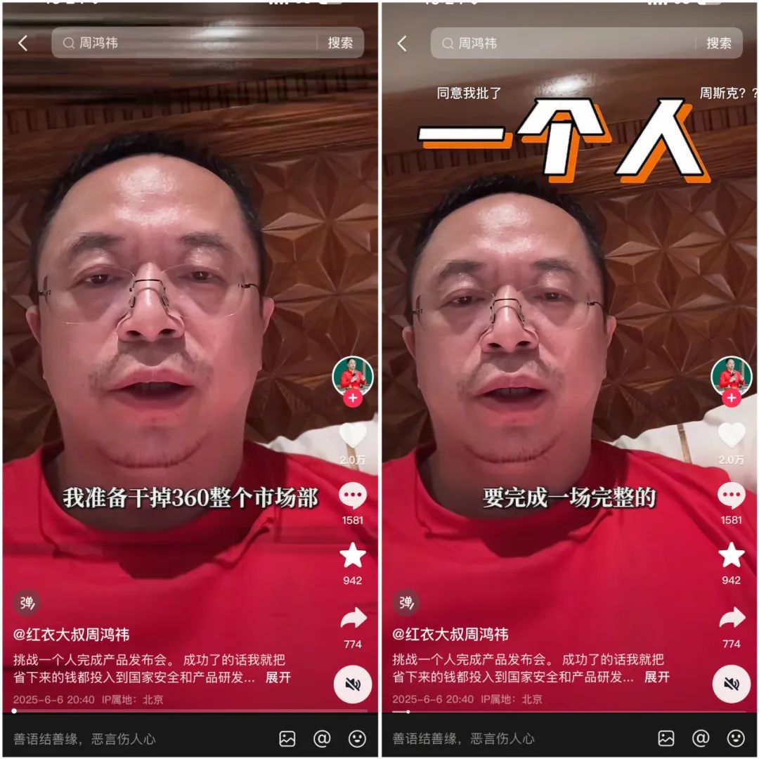 回顾周鸿祎的过往,他从不缺乏制造话题的能力。从早期与各大互联网大佬的“口水战”,到后来坐在车顶当“车模”,再到“网红企业家IP”,周鸿祎总是能成功吸引大众的目光。作为在抖音平台拥有1600多万粉丝的博主,“红衣大叔周鸿祎”是名副其实的网红,用个人账号的网红效应为360业务宣传,周鸿祎深谙此道。