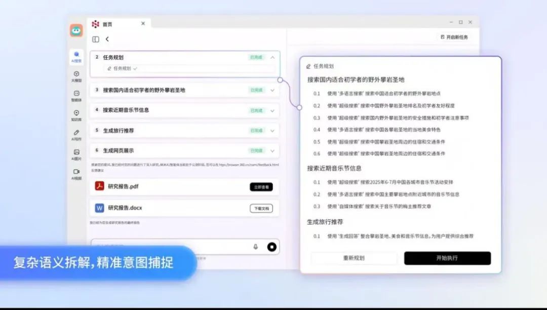 从如今的能力来看,不同于以往AI搜索只能生成文字答案,纳米AI超级搜索可以在没有人工干预的情况下自主进行思考、直接调用浏览器和外部工具自动执行任务。