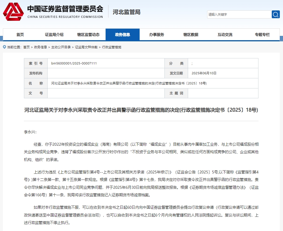 上述行为违反了上市公司相关法律法规,河北证监局决定对李永兴采取责令改正并出具警示函的行政监管措施。责令李永兴尽快解决福成实业与上市公司同业竞争问题,并于2025年6月30日前向河北证监局报送整改报告。根据相关法律规定,河北证监局将该行政监管措施记入证券期货市场诚信档案。