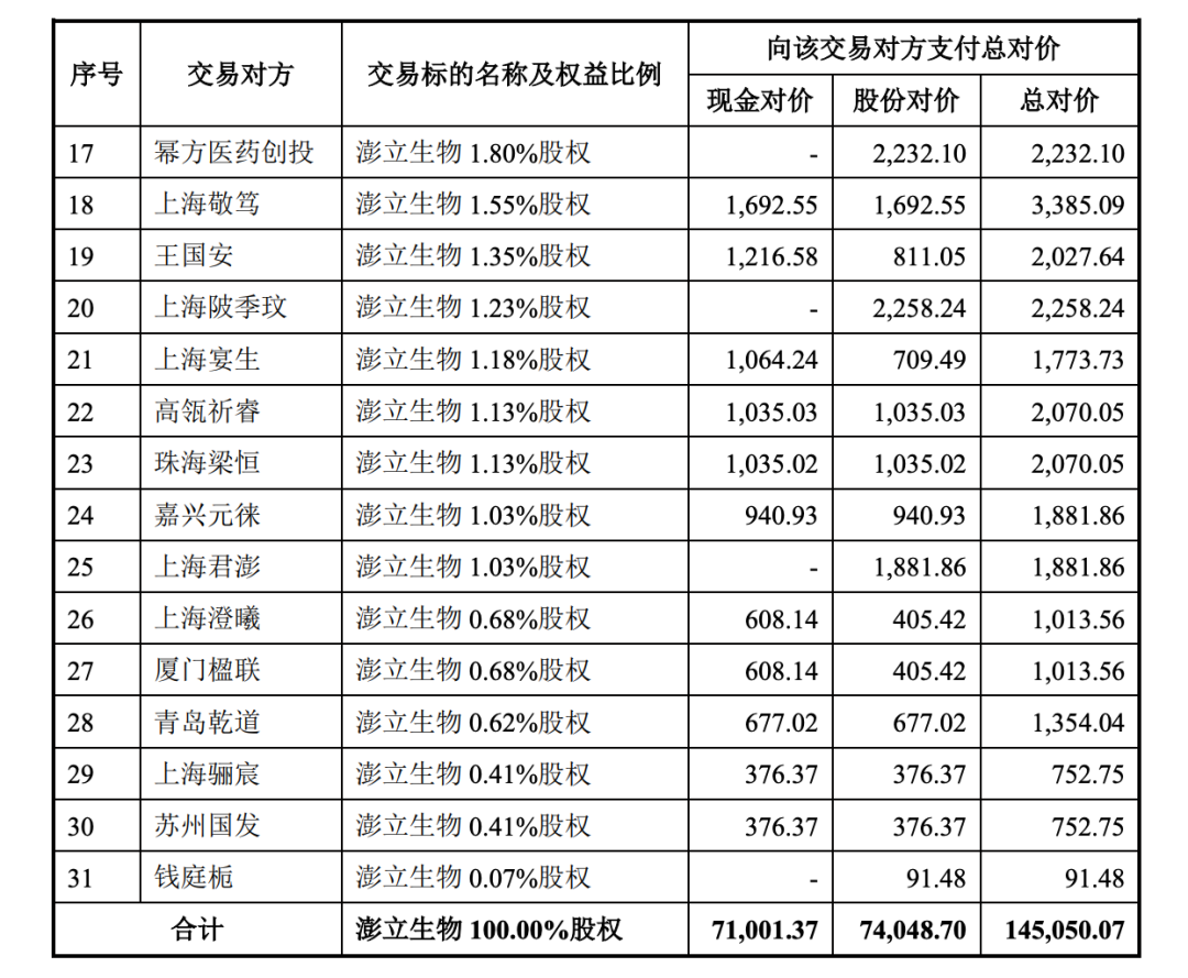 值得注意的是,在本次交易中,尽管澎立生物整体估值14.51亿元,但奥迈普给不同交易对手给出的交易价格却不一样,采用了差异化估值定价模式,即“同股不同价”。
