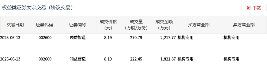 6月13日,领益智造大宗交易成交493.24万股,成交额4039.64万元,占当日总成交额的2.54%,成交价8.19元,较市场收盘价8.19元持平。