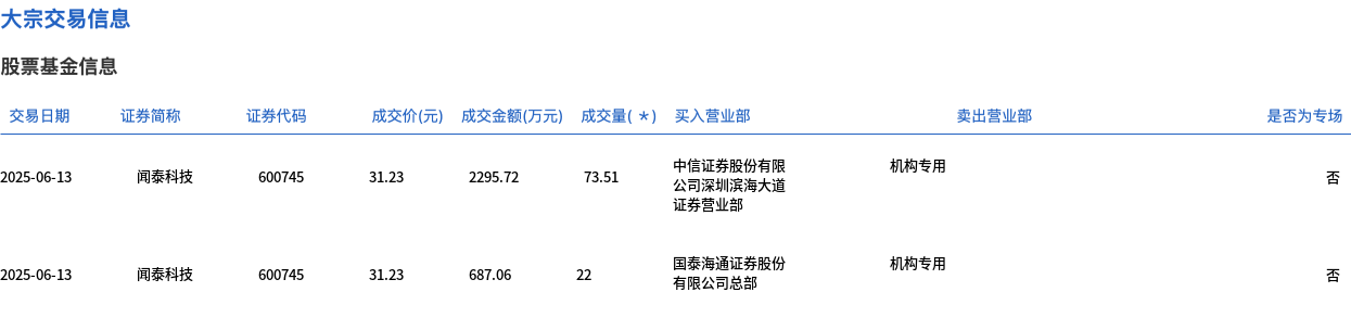 6月13日,闻泰科技大宗交易成交95.51万股,成交额2982.78万元,占当日总成交额的2.43%,成交价31.23元,较市场收盘价31.23元持平。