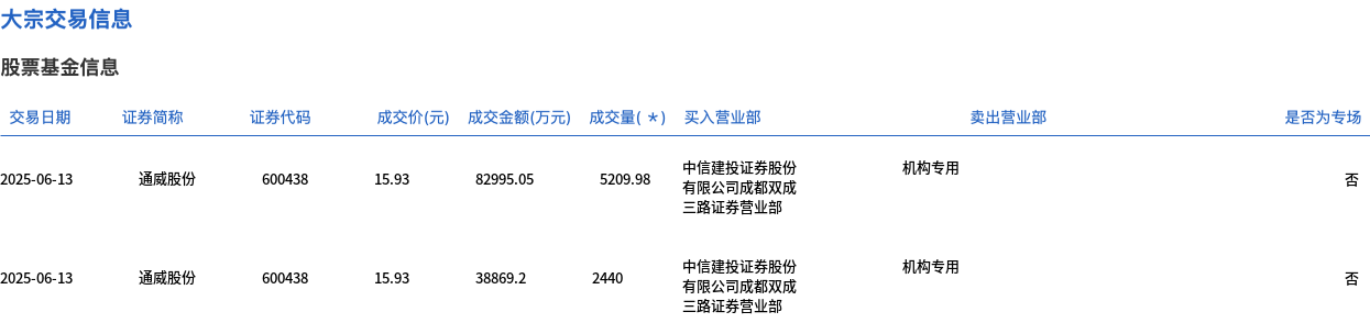 6月13日,通威股份大宗交易成交7649.98万股,成交额12.19亿元,占当日总成交额的57.83%,成交价15.93元,较市场收盘价15.93元持平。