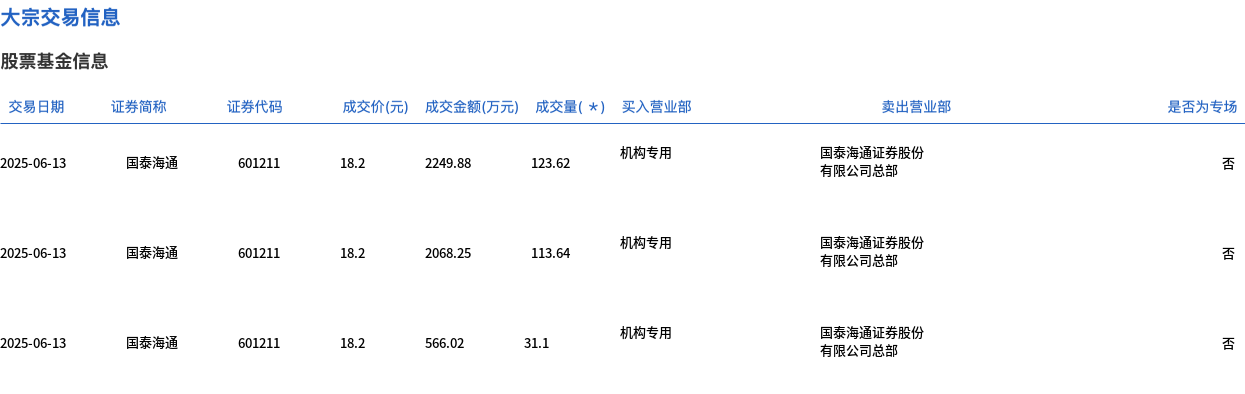 6月13日,国泰海通大宗交易成交268.36万股,成交额4884.15万元,占当日总成交额的1.31%,成交价18.2元,较市场收盘价18.2元持平。