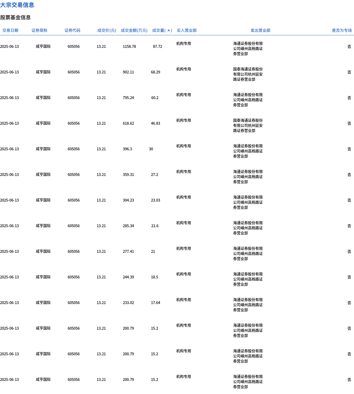 6月13日,咸亨国际大宗交易成交467.61万股,成交额6177.12万元,占当日总成交额的44.3%,成交价13.21元,较市场收盘价14.83元折价10.92%。