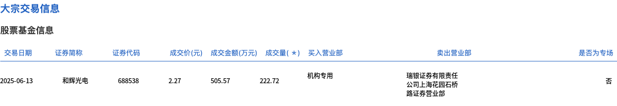 6月13日,和辉光电大宗交易成交222.72万股,成交额505.57万元,占当日总成交额的1.3%,成交价2.27元,较市场收盘价2.27元持平。