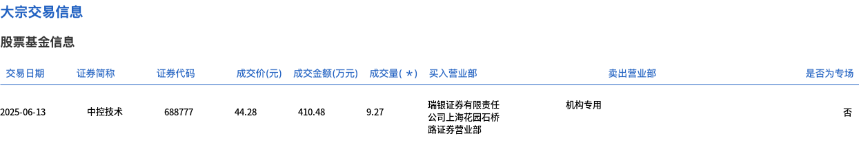 6月13日,中控技术大宗交易成交9.27万股,成交额410.48万元,占当日总成交额的0.89%,成交价44.28元,较市场收盘价44.28元持平。
